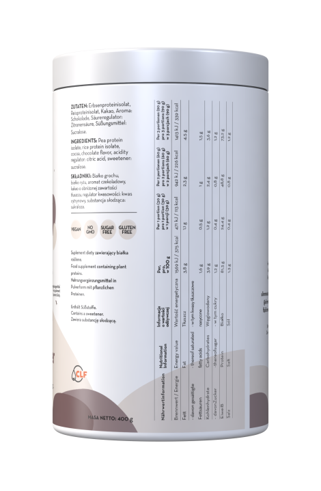 Vegan Protein Powder o smaku czekoladowym 400g organizm może wykorzystać do budowania i utrzymania mięśni2, co pozwala na osiągnięcie pięknej, wyrzeźbionej sylwetki.