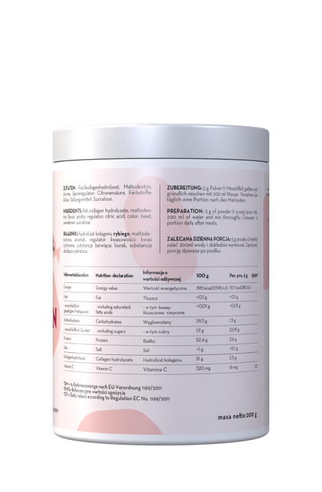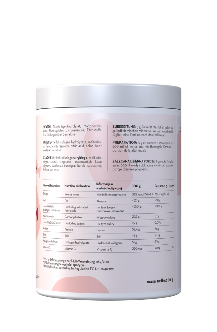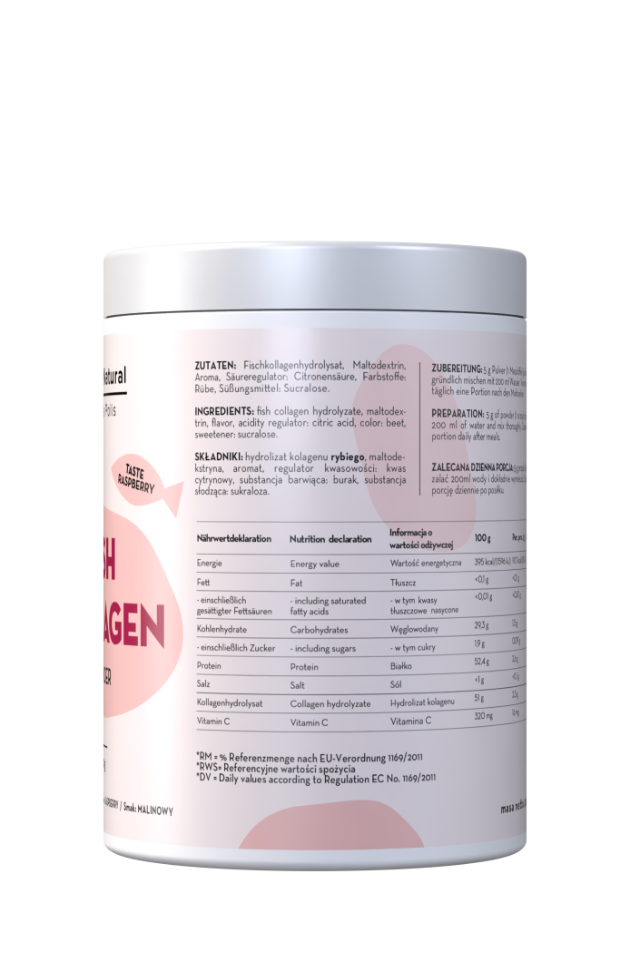 Fish Collagen Powder Malina to proszek kolagenu hydrolizowanego z ryb o delikatnym smaku maliny. Produkt ten zawiera naturalnie występujące peptydy kolagenowe, które są ważne dla utrzymania zdrowej skóry, włosów, paznokci, stawów i kości. Fish Collagen Powder Malina może być dodawany do różnych płynów i napojów, co czyni go łatwym i wygodnym w użyciu. Produkt jest wolny od sztucznych barwników, konserwantów ani dodatków, dzięki czemu jest idealnym wyborem dla osób, które preferują naturalne produkty. Fish Collagen Powder Malina to doskonały sposób na zadbanie o swoje zdrowie i urodę w naturalny sposób.